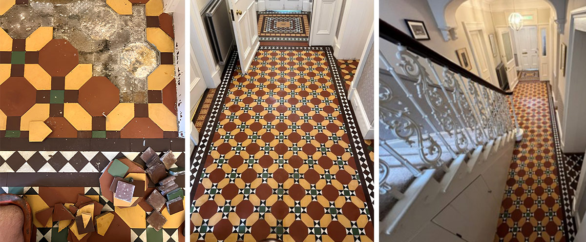 We had to approach this in a sensitive way with minimal saturation of the Victorian tiles during the cleaning of the work and using latex bound screed so as not to introduce excess water into the floor and exacerbate the efflorescence. It was an extensive project and the finish was testament to our skills in repair, clean and care of Victorian tile floors.